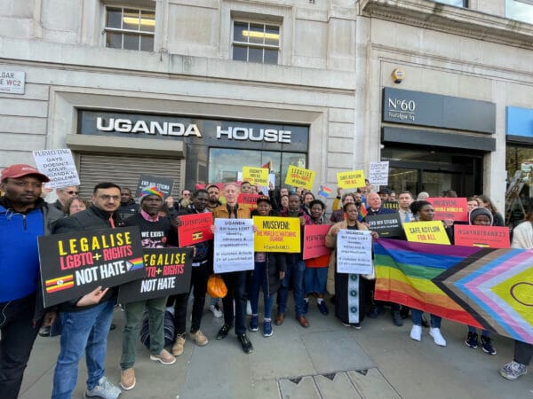 Fifty LGBTQ+ campaigners and allies staged a noisy vigil outside the Ugandan High Commission in Trafalgar Square, London on Tuesday, April 25, chanting “Museveni! Kill the bill” and “The world is watching! Kill the bill.” They were protesting in solidarity with Ugandan LGBTs against Uganda’s Anti-Ho