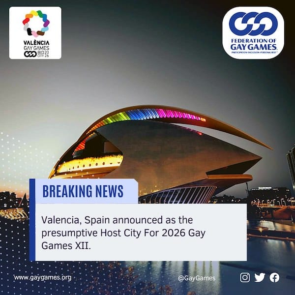 Valencia, Spain was chosen as a presumptive host city for the 2026 Gay Games XII at a ceremony at the Royal Pavilion in Brighton last night.