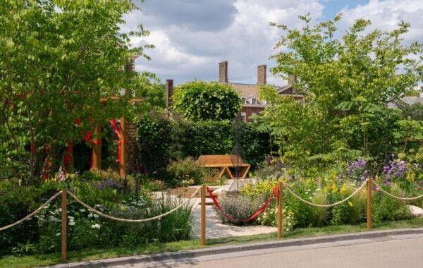 Designed by award-winning garden designer Manoj Malde, the garden reflects the significant advancements made in HIV treatment, prevention and care over the last 40 years. The garden includes hexagonal paving that reflects a key chemical structure found within many HIV medications and red ribbons, a universal symbol of HIV awareness and support.