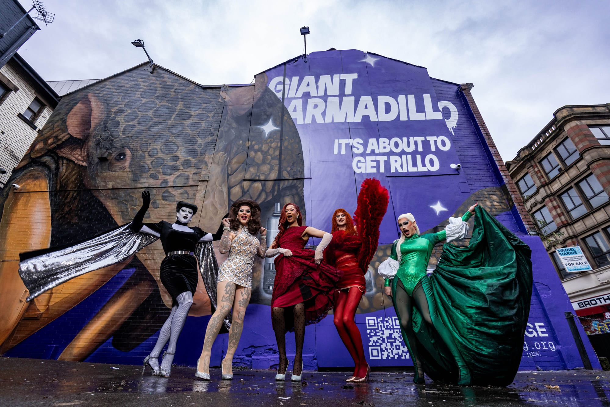 Winner of RuPaul's Drag Race vs. The World, Tia Kofi - together with drag royalty Lill, Banksie, Liquorice Black and Actavia - rallied together to unveil a giant armadillo mural in Manchester, home to one of the UK’s most vibrant drag scenes, in support of global icon Bob the Drag Queen and his new track Giant Armadillo.