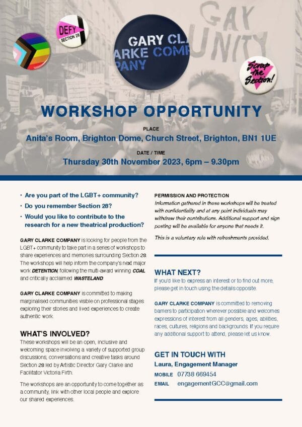 Gary Clarke Company, the pioneering dance theatre company, is seeking people from the LGBTQ+ community to take part in a workshop to share experiences and memories around Section 28. This workshop, which will take place in Anita’s Room at Brighton Dome on Thursday, November 30 from 6pm, will inform the company’s next major work DETENTION, following the multi-award winning COAL and critically-acclaimed WASTELAND.