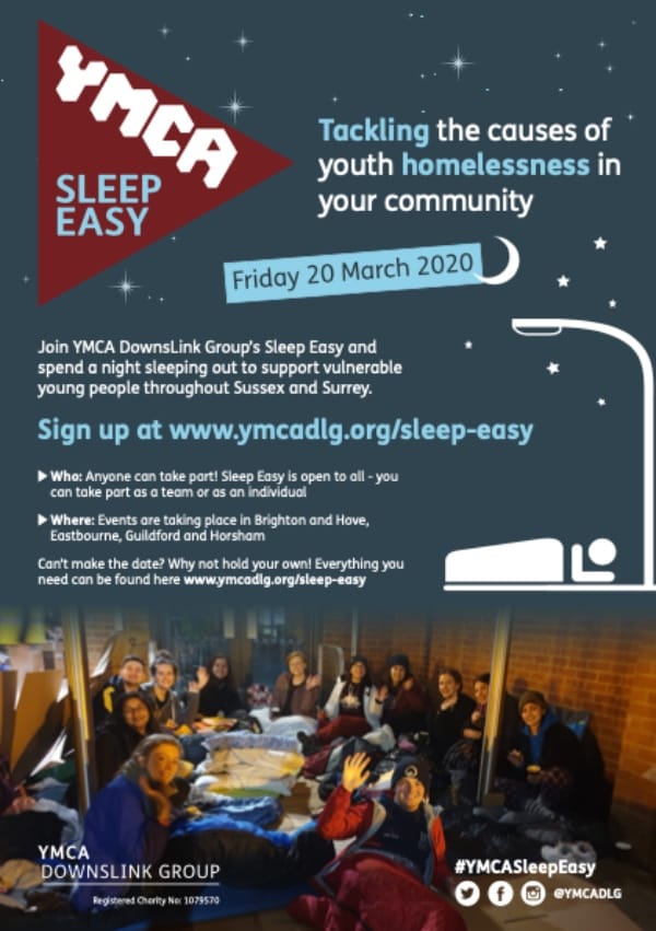 YMCA Brighton & Hove is part of the bigger YMCA Downslink Group which runs local YMCAs across Sussex and Surrey. Across the region hundreds of people challenge themselves to spend a night outside to raise money for this local youth charity which works throughout the year to tackle the root causes of youth homelessness. This year, the charity aims to raise £60,000 to support local young people and is encouraging people, of all ages and from all walks of life, to sign up to their event in Brighton on Friday 20 March 2020.