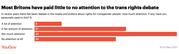 But despite Westminster’s fixation with such issues – alongside sections of the media and Twitter – the public themselves are far less invested. Two thirds of Britons say they pay little attention (42%) or no attention (24%) to the debate in the media and politics about trans rights.