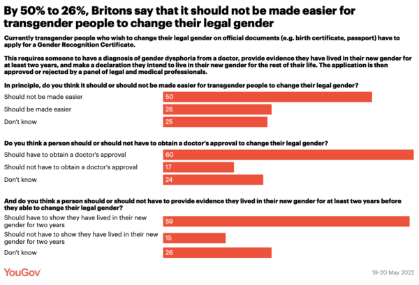 Opposition is higher still when it comes to the specific aspects we highlighted. By 60% to 17%, Britons think the legal process should continue to require a doctor’s approval, and by a similar 59% to 15%, Britons say transgender people should continue to have to show they have lived in their new gender for two years before the change can be legally accepted.