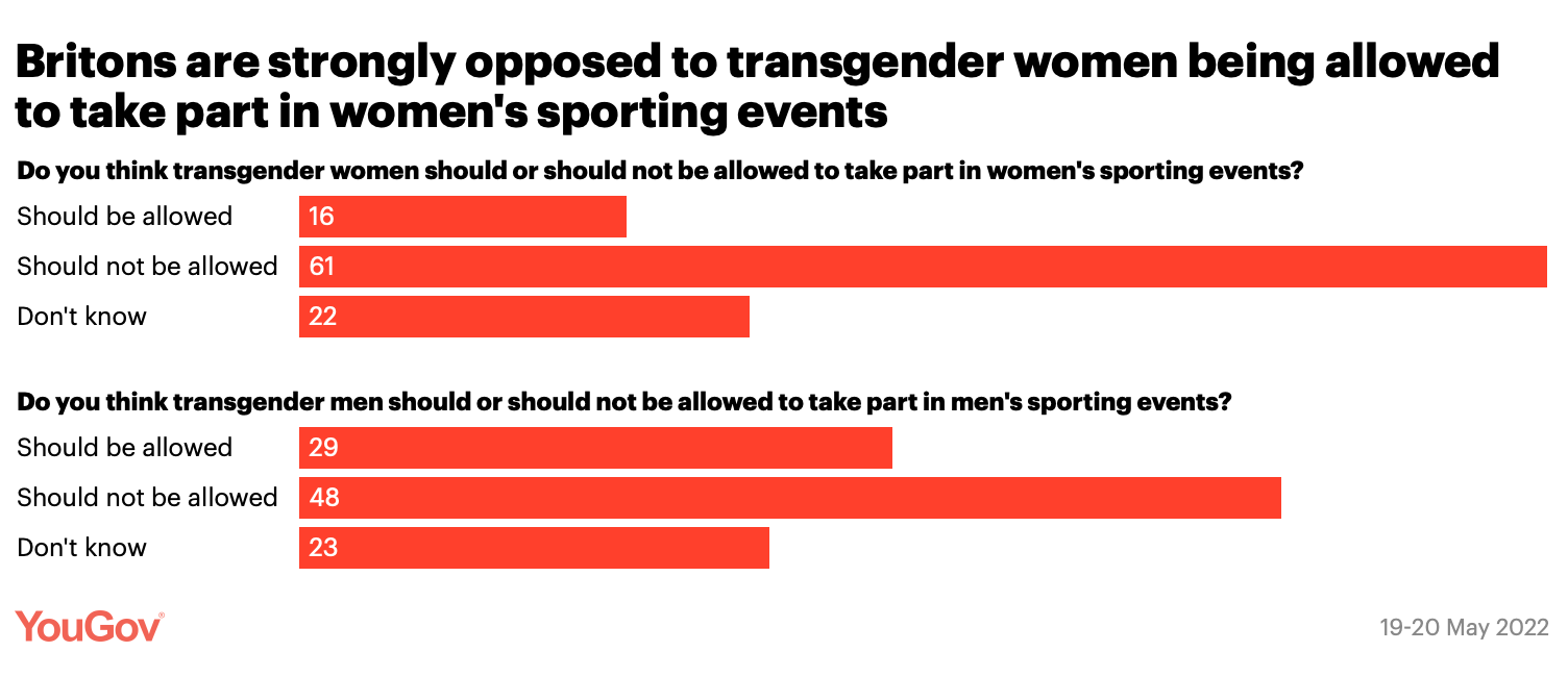 The public are strongly opposed to trans women athletes participating in women’s sporting events, by 61% versus just 16% who are supportive.