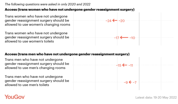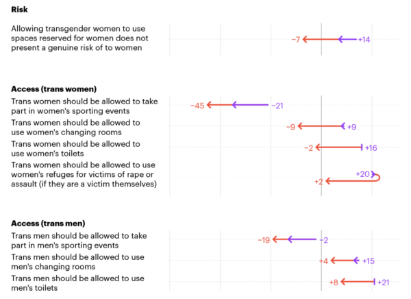 For trans men, this margin of acceptance has also closed, although opinion is still slightly in favour of allowing access to men’s changing rooms and toilets.