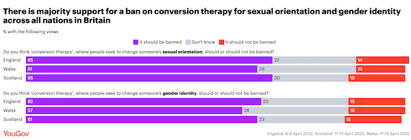 Across Britain, there is majority support for both bans in England (65% for sexual orientation, 62% for gender identity) and Scotland (65% for sexual orientation, 61% for gender identity).