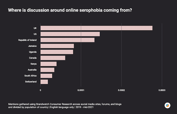 - Roughly 22% of the global discussion was from the UK with 41,263 posts about serophobic hate speech or instances of serophobia in the past 2.5 years. Since the start of the pandemic in March 2020, serophobia discussion fell by 42% in the UK.